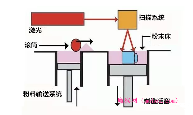 3DP具有能夠大規模成型出陶瓷部件,成本較低的優勢,但也具有黏結劑黏合強度受限導致部件強度有限,難以得到機械性能優良的陶瓷器件的劣勢。 5激光選區燒結/熔融(SLS/SLM) SLM 的思想最初由德國Fraunhofer研究所于1995年提出,SLS和SLM原理與三維印刷技術較類似,將粘接劑換為激光束。在高功率比重激光器激光束開始掃描前,水平鋪粉輥先把金屬粉末平鋪到加工室的基板上,然后激光束將按當前層的輪廓信息選擇性地熔化基板上的粉末,加工出當前層的輪廓,然后調入下一圖層進行加工,如此層層加工,直到整個部件加工完畢。