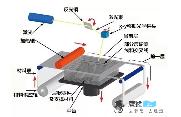 SLA具有成型精度極高陶瓷件燒結后致比重高的優勢;但存在后續工藝麻煩,以及二次固化問題,另外,SLA難以加工折射率較高的陶瓷材料。 7疊層實體制造(LOM) 在層片疊加制造工藝中,將單面涂有熱溶膠的箔材通過熱輥加熱,由紙、陶瓷箔、金屬箔等構成的材料就會粘接在一起。然后上方的激光器按照CAD模型分層數據,用激光束將箔材切割成所制部件的內外輪廓,再鋪上新的一層箔材,重復上述過程,直至整個零部件打印完成。