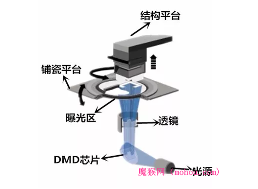 SLS/SLM工藝使用的一般是塑料、蠟、陶瓷、金屬或其復合物的粉末,其具有無需支撐即可制備復雜陶瓷部件的優點,但也存在因受到粘接劑鋪設比重的限制導致陶瓷制品致比重不高的問題。 6光固化快速成型技術(SLA) SLA技術是通過激光的掃描曝光實現單層的固化。通過紫外激光束,按照設計好的原件層截面,聚焦到工作槽中的陶瓷光敏樹脂混合液體,逐點固化,由點及線,由線到面。通過xy方向固化成面后,通過升降臺在z軸方向的移動,層層疊加完成三維打印陶瓷部件。