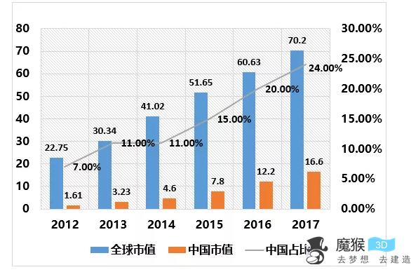 2012-2017全球及中國3D打印產業規模