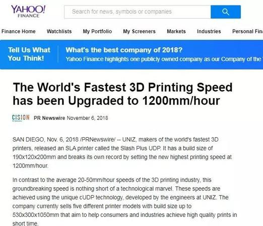 據多家外媒報道,美國東部時間2018年11月6日,早上 8:09 ,全球最快3D打印速度再次被UNIZ科技改寫!UNIZ科技的桌面級3D打印機在cUDP(連續單向剝離)超高速模式下,實現了1200mm/Hour驚人打印速度。而同行業的其他3D打印機平均打印速度在20-50mm/hour。